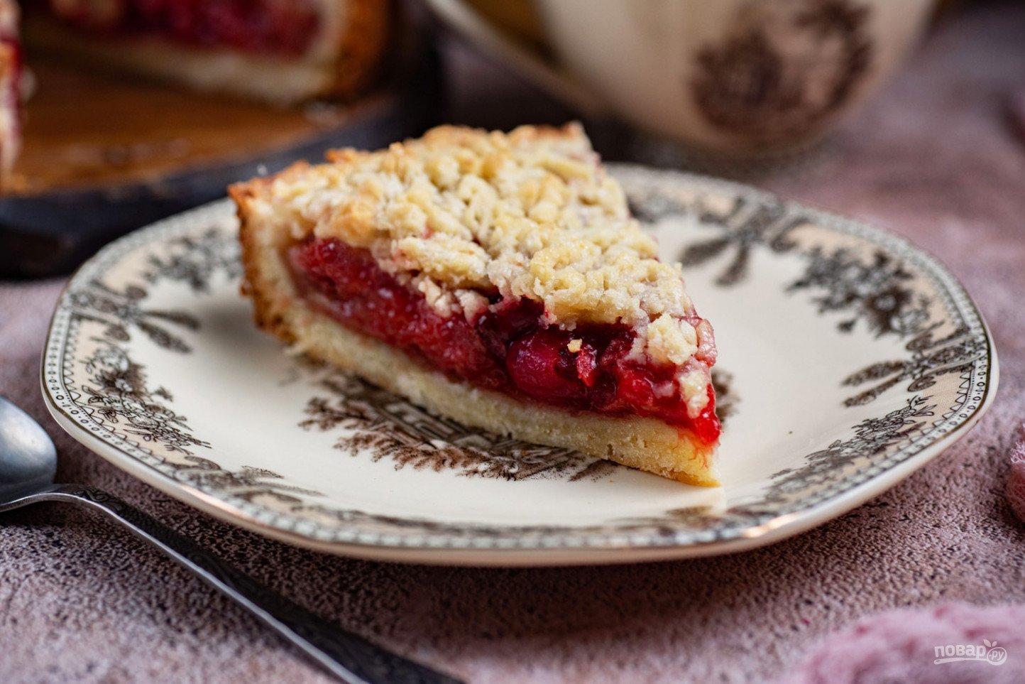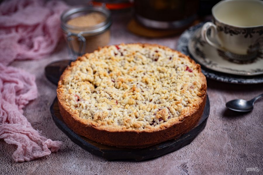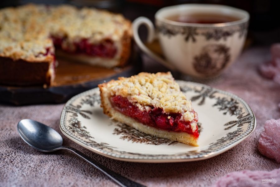 Меньшую часть охлажденного теста натрите на крупную терку и распределите по поверхности ягодной начинки. Отправьте заполненную форму в заранее разогретую до 180 градусов духовку на 40 минут.