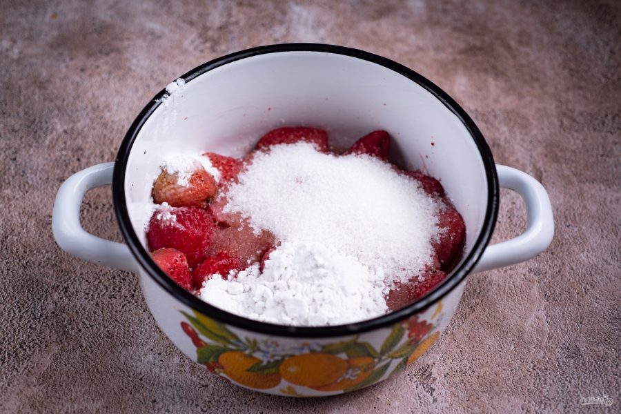Для того, чтобы ягодная начинка не вытекала из готового пирога, добавьте в процессе варки к ягодам крахмал. На 400 грамм ягод 2 столовые ложки крахмала вполне хватит — больше добавлять не надо. Крахмал обязательно выбирайте кукурузный. Ягоды можно брать абсолютно любые. Если ягоды замороженные, как у меня, то их обязательно нужно разморозить.Состав / Ингредиенты: