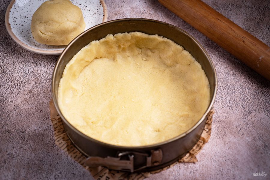 Хорошо охлажденное тесто поделите на две неравные части. Большую часть теста раскатайте скалкой в круг и выложите в форму для выпекания (предварительно застелите пергаментом), сформируйте бортики высотой примерно в 3-4 см.
