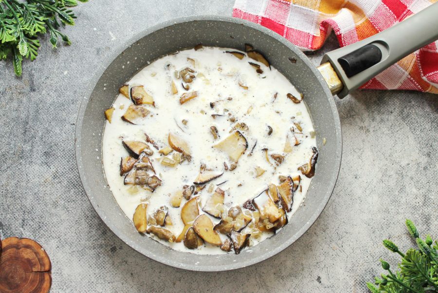 Влейте в сковороду сливки, убавьте огонь и тушите все 8 минут, следя, чтобы не пригорело. Сковороду с готовой подливой снимите с огня и сразу подавайте к столу.