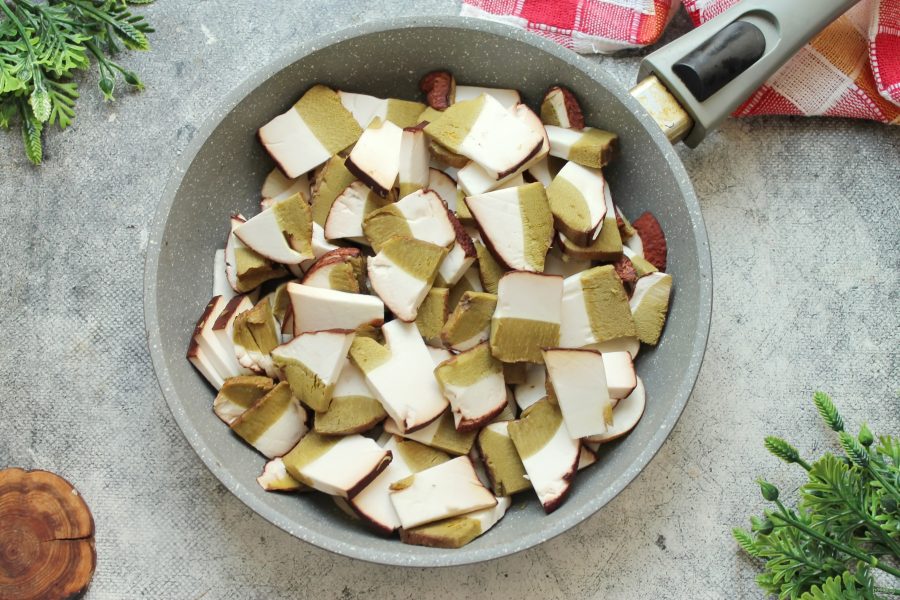 Свежие белые грибы переберите, удалите места загрязнений и сполосните холодной водой. Разложите их на бумажном полотенце и дайте воде стечь.