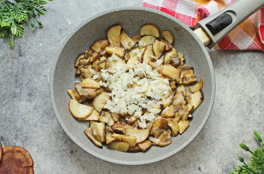 Репчатый лук мелко порежьте и добавьте в сковороду. Обжаривайте все на среднем огне еще 5-6 минут, аккуратно перемешивая.