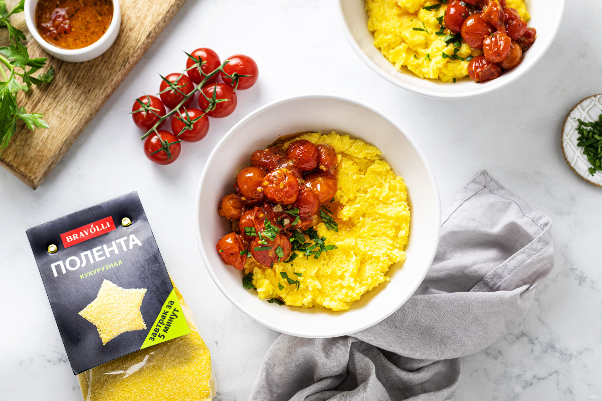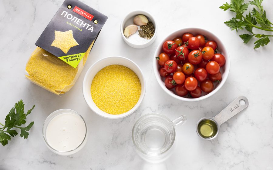 Выложите в глубокую миску поленту, добавьте жареные помидоры черри. Сверху посыпьте мелко порубленной петрушкой. Приятного вам аппетита!