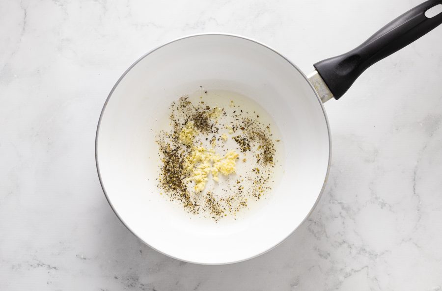 В сковороде разогрейте растительное масло. Обжарьте измельченный чеснок и специи пару секунд до раскрытия аромата.