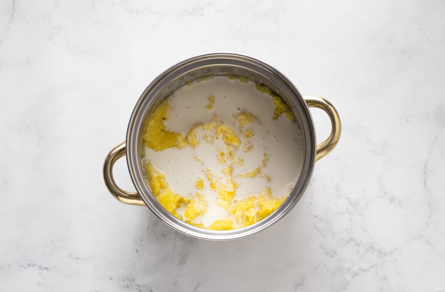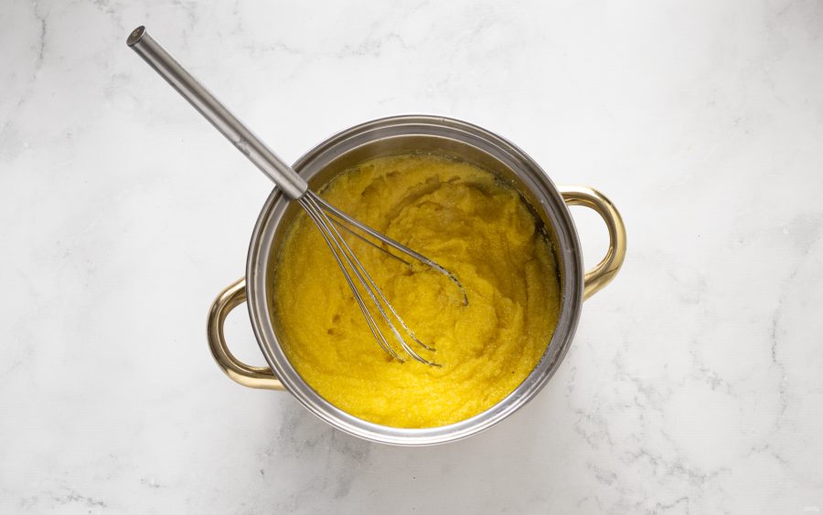 Доведите воду с щепоткой соли до кипения. Насыпьте в кастрюлю тонкой струйкой поленту. Убавьте огонь до минимального и варите ее 5 минут. Активно помешивайте.