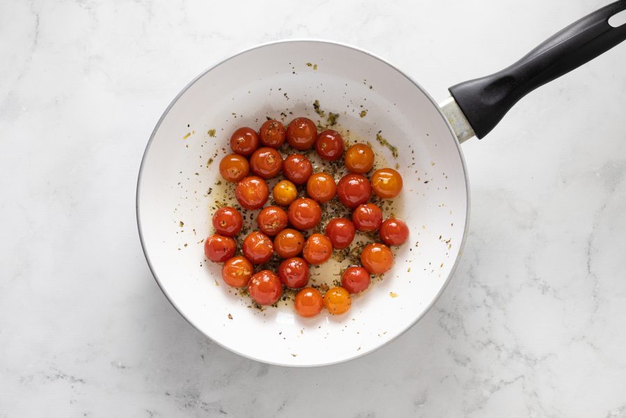 Следом добавьте помидоры черри. Жарьте их 7-8 минут, пока они не раскроются и не дадут сок.