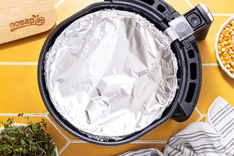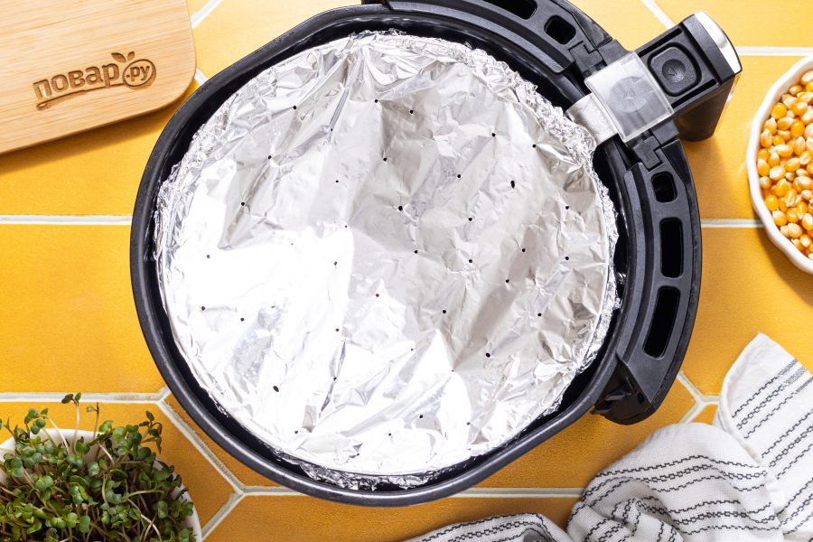 Переложите их в чашу аэрогриля. Если зерна будут проваливаться сквозь решетку, то заранее застелите ее фольгой или пергаментом.