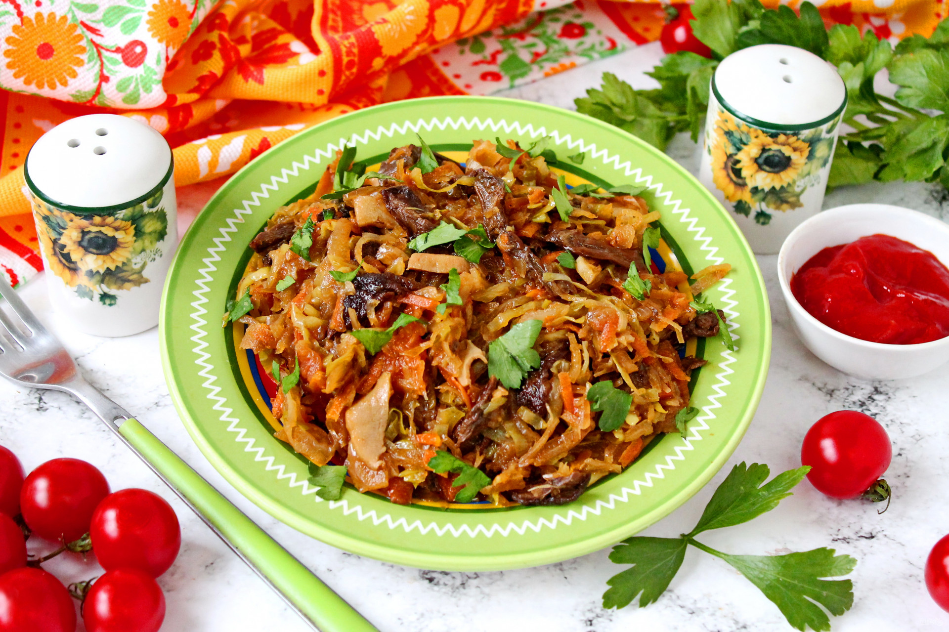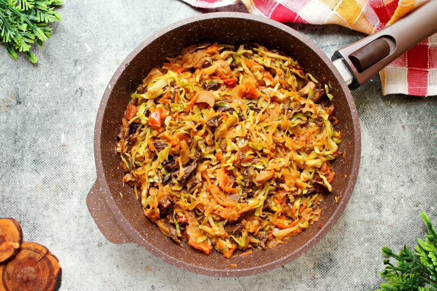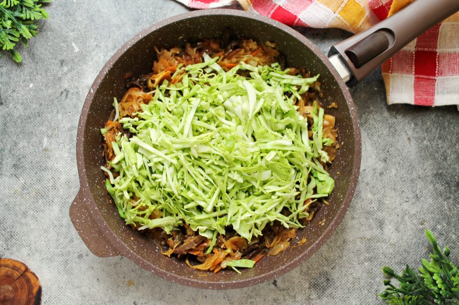 Белокочанную капусту разделите на листья, срежьте толстые жилы. Листья порежьте соломкой и добавьте в сковороду.