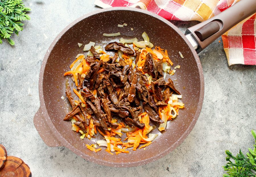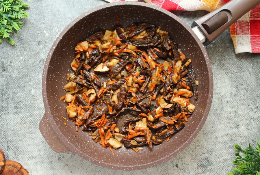 Готовьте все в течение 5-7 минут. Жидкость должна выпариться, а грибы немного обжариться. Вместо замороженных грибов, можно взять свежие лесные, шампиньоны или вешанки.