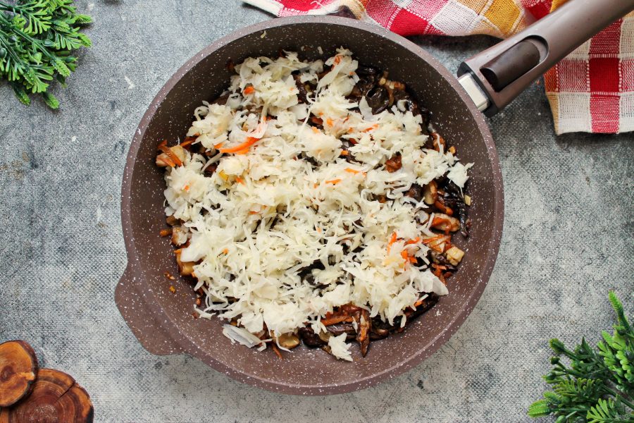 Квашеную капусту отожмите, порежьте на части, если соломка длинная и выложите в сковороду, перемешайте.