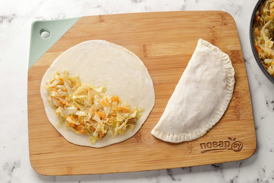 На нижнюю часть круга выложите начинку, не доходя немного до краёв теста. Накройте начинку верхней частью теста, выпустите воздух и соедините края вилкой.