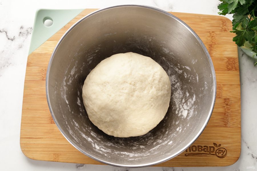 Затем, подсыпая оставшуюся муку, замесите эластичное нелипкое тесто. В зависимости от качества муки её может понадобиться больше или меньше, смотрите на консистенцию теста. Если тесто всё ещё липнет, а муки требуется ещё больше, чем по рецепту, не забивайте тесто мукой, иначе в готовом виде тесто получится слишком плотное и невкусное. Лучше посыпьте мукой скалку и стол при раскатке. Тесто скатайте в шар, заверните в пищевую плёнку и оставьте на 30 минут при комнатной температуре.