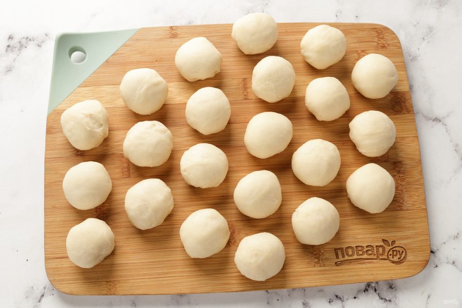 Тесто разделите на равные части. Я готовлю небольшие чебуреки и делю тесто на кусочки по 30 грамм, у меня получилось 22 шт. Если вы любите крупные чебуреки, то разделите тесто на 14-12 частей.