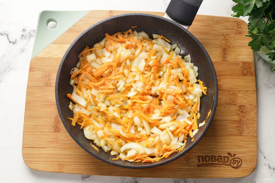 Теперь приготовьте начинку. Морковь очистите, натрите на крупной тёрке. Лук очистите и нарежьте мелкими кубиками. Переложите овощи на разогретую сковороду с маслом.