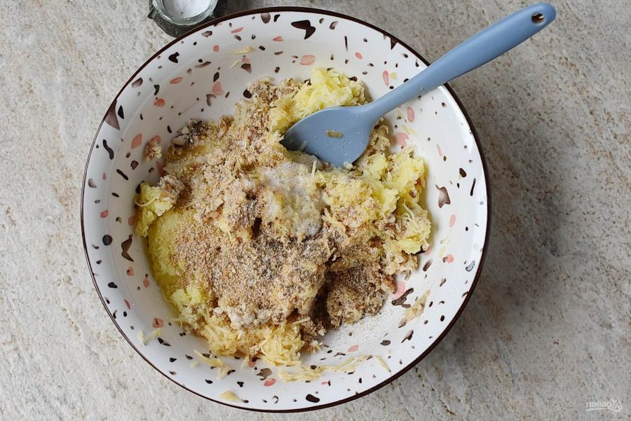 Добавьте в миску чесночный порошок и панировочные сухари. Посолите и поперчите по вкусу. Слейте жидкую часть картофельного сока и добавьте в миску осевший на дно крахмал. Хорошо перемешайте массу.