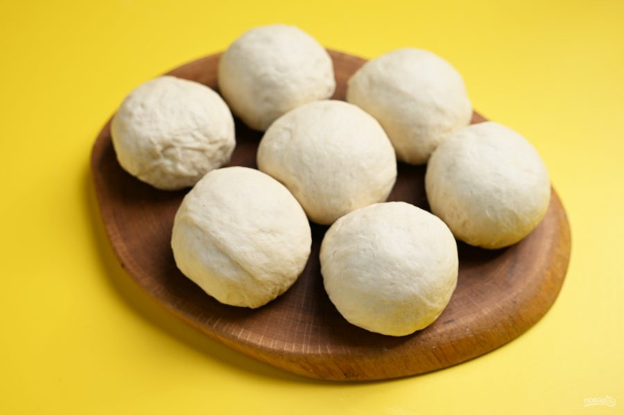 Замесите мягкое, не прилипающее к рукам тесто, округлите его в миске. Миску с тестом затяните пищевой пленкой и оставьте в покое на 1-1.5 часа — тесто должно подойти.