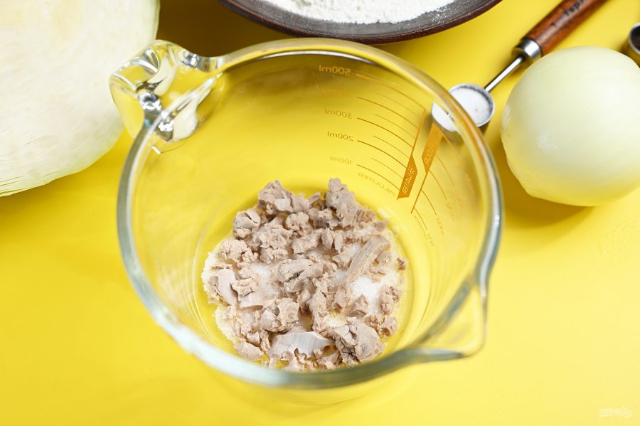 Приготовьте сначала опару. Для этого в удобной емкости пальцами разотрите свежие дрожжи, к ним добавьте сахар.