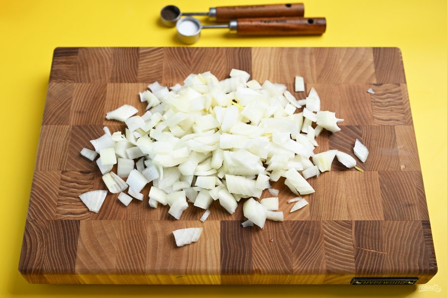 Пока подходит тесто займитесь начинкой. Мелко нашинкуйте лук.