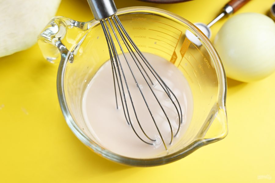 Залейте к ним теплую воду и венчиком хорошенько все размешайте до растворения дрожжей.