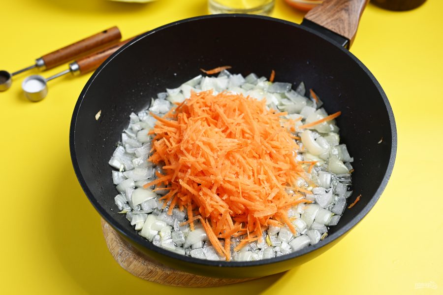 В сковороде разогрейте растительное масло и выложите измельченный лук — обжаривайте лук на среднем огне до легкого золотистого оттенка.