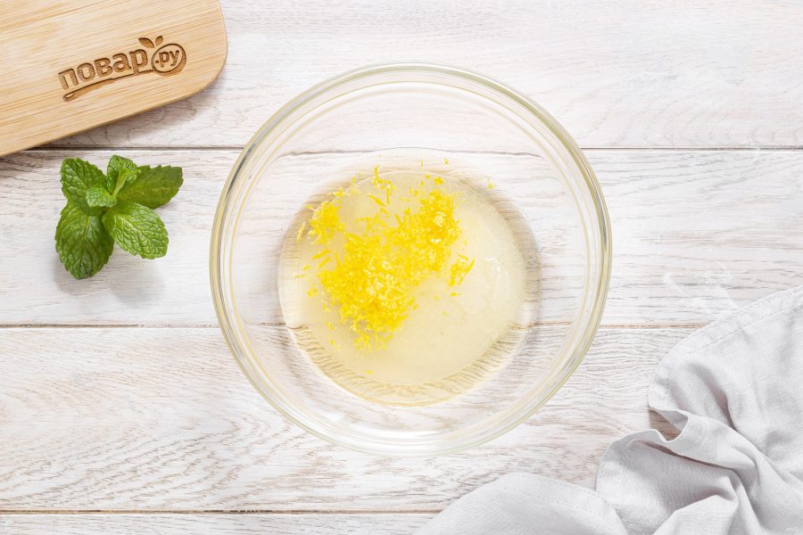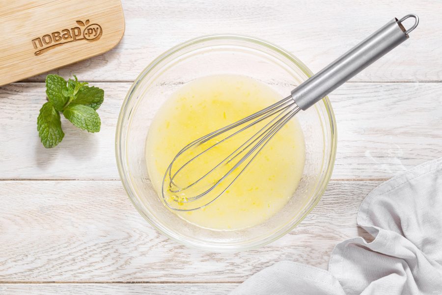 В глубокую миску влейте растительное масло. Добавьте лимонный сок, цедру лимона, сахар и соль. Все перемешайте венчиком.