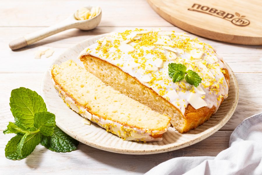 Смажьте верхушку кекса урбечем из кокоса, а сверху украсьте лимонной цедрой и миндальными лепестками.