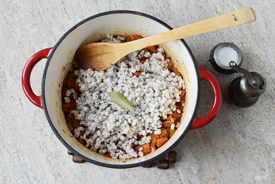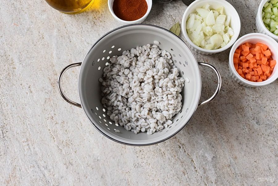 Перловую крупу заранее замочите на два-три часа, промойте и отварите в свежей воде почти до готовности. Откиньте на дуршлаг и используйте в блюдах.