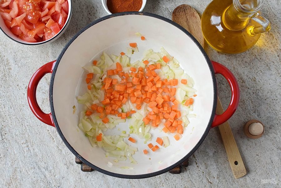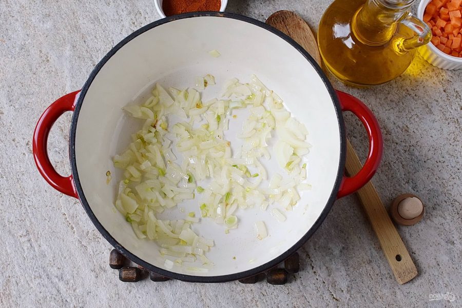 Разогрейте растительное масло в кастрюле с толстым дном. Добавьте нарезанный лук и слегка обжарьте при помешивании до мягкости, не давая луку румяниться.