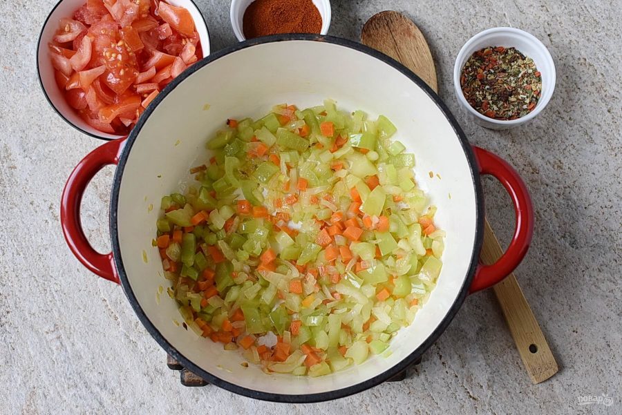 Добавьте перец и сельдерей. Обжарьте еще пару минут.