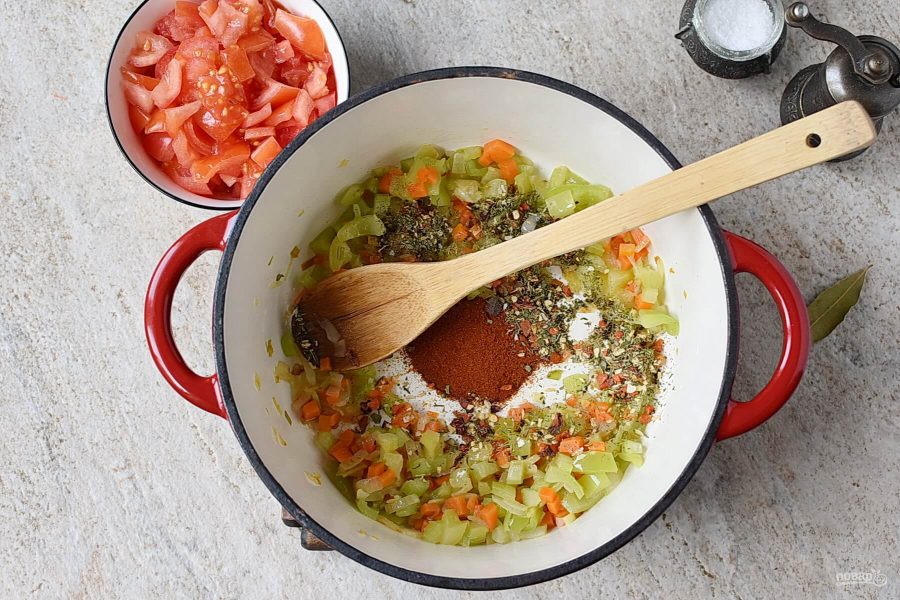 Разгребите овощи по краям кастрюли. В середину всыпьте паприку и сушеную овощную смесь. Прогрейте секунд 30 до появления аромата.