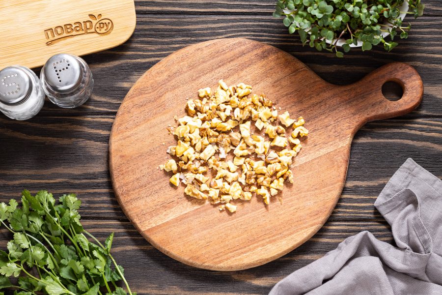 Чеснок пропустите через пресс. Добавьте в миску, приправьте салат хмели-сунели, черным молотым перцем и посолите по вкусу.