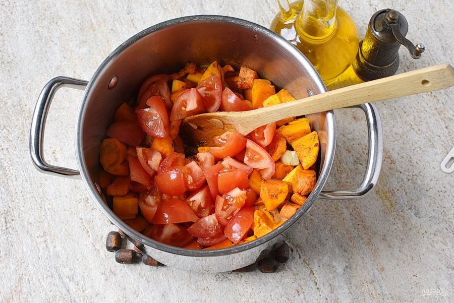 Добавьте нарезанные помидоры и тушите 5 минут.