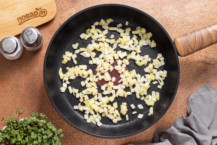Разогрейте сковороду на среднем огне, влейте растительное масло. Выложите репчатый лук и жарьте пару минут до мягкости.