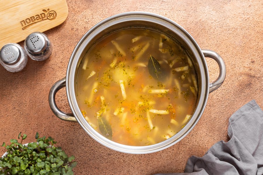 Варите суп еще 7 минут на медленном огне. После снимите с плиты, накройте крышкой и дайте настояться еще 10-15 минут.
