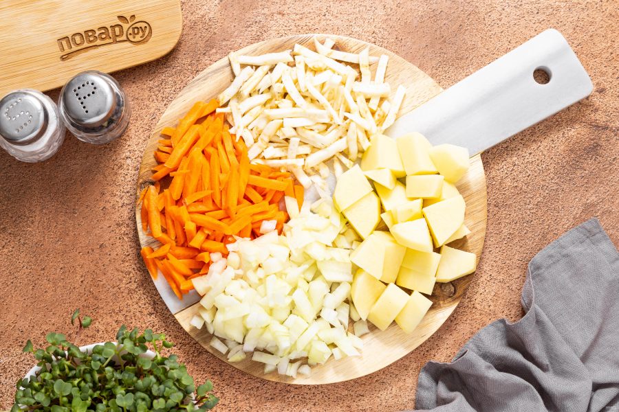 Морковь и корень сельдерея очистите от кожуры, нарежьте брусочками. Репчатый лук нарежьте кубиками, а картофель на ломтики среднего размера.