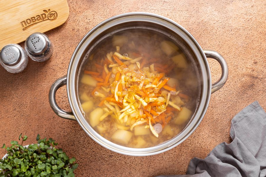 Добавьте овощную зажарку в кастрюлю.