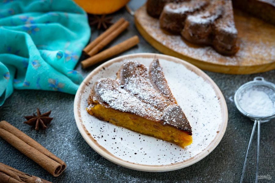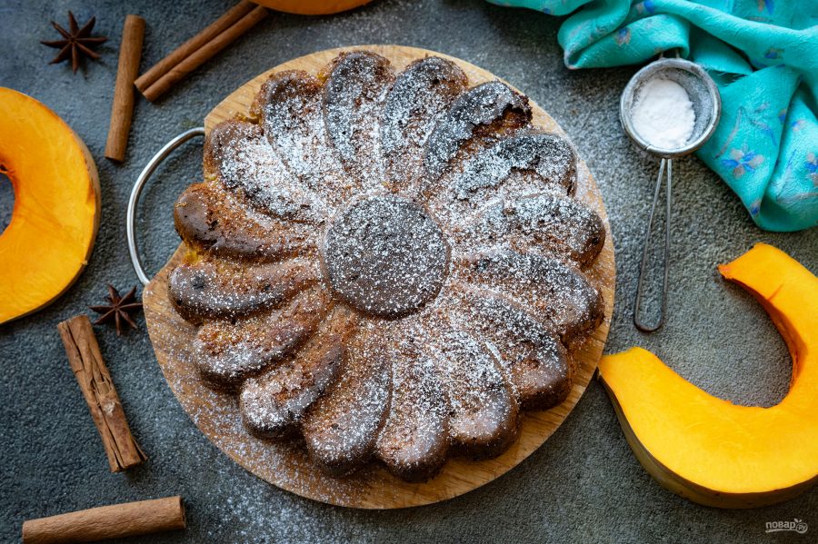 Готовый пирог охладите, присыпьте сахарной пудрой и подавайте к столу.
