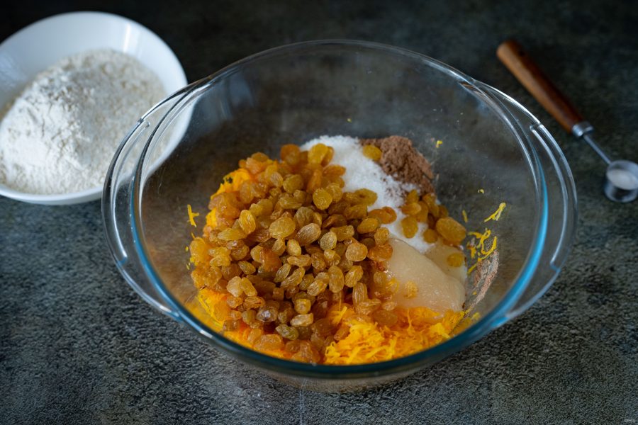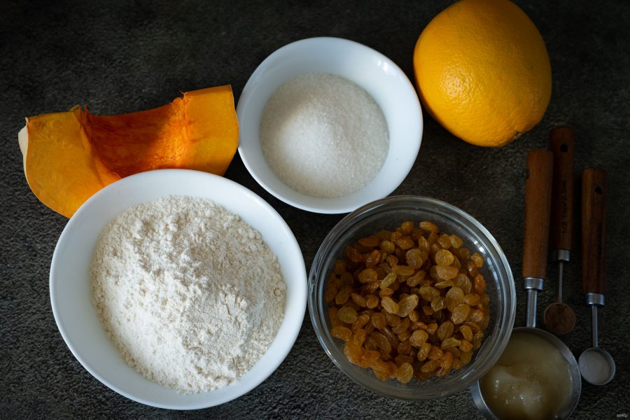 Перед началом приготовления просейте муку, почистите кусочек тыквы от семян и кожуры, промойте изюм и просушите на бумажных полотенцах, тщательно вымойте поверхность апельсина.