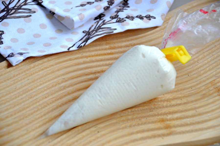 Через 30 минут отсадите эклеры на лист для выпечки. Разогрейте духовку в режиме "Верх-низ" до 200 градусов. Сразу, после того, как вы поместили противень в духовку, понизьте температуру до 180 градусов и выпекайте 10 минут, после этого понизьте температуру до 140 градусов и выпекайте еще около 55-60 минут.