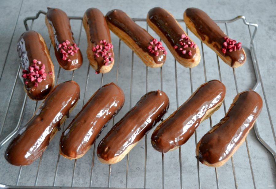 Окуните верхнюю часть эклера в шоколадную глазурь, декорируйте сублимированными ягодами. Выложите на решетку для стабилизации шоколада.