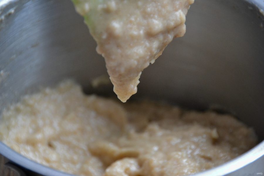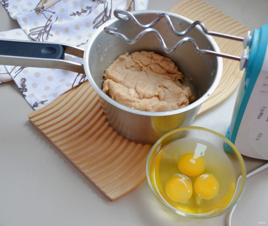Готовое тесто должно быть текучим и плавно сползать с силиконовой лопаточки в виде треугольника. Если трех яиц будет недостаточно, добавьте еще небольшое количество яйца до достижения нужной консистенции.