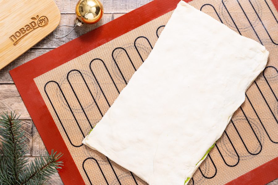 Тесто раскатайте в прямоугольник толщиною примерно 3-4 мм.