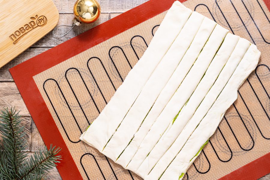 Разделите на 2 равных части. Смажьте одну половину соусом песто.