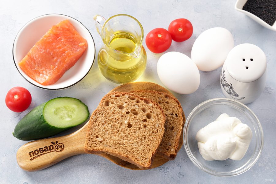 На большую плоскую тарелку выложите листья салата, кусочки хлеба с нежным творожным сыром, жареные яйца, нарезанные огурцы и ломтики красной рыбы. Помидоры черри можно добавить целиком или разрезать их пополам. Перед подачей добавьте кунжут и любую свежую зелень. Праздничный завтрак готов. Приятного аппетита!