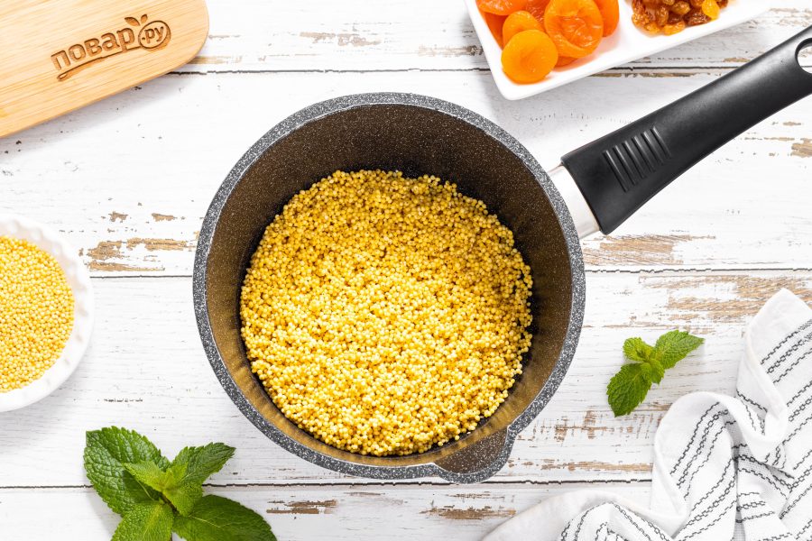 Пшено тщательно промойте в воде несколько раз. Замочите в теплой воде на 1 час, а после слейте воду, а пшено еще раз промойте. Откиньте на сито, дайте стечь лишней жидкости.