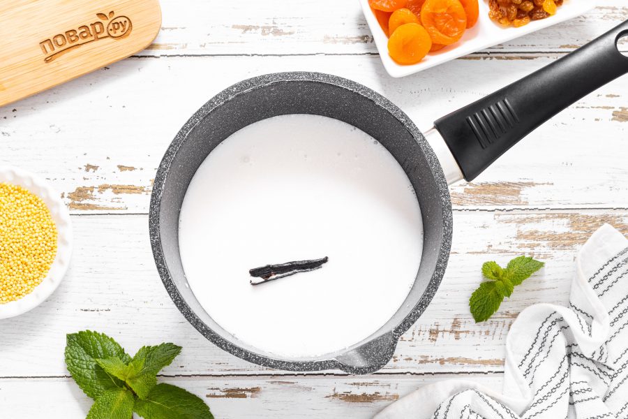 Переложите пшено в кастрюлю с толстым дном. Добавьте сахар, щепотку соли и кусочек ванильного стручка.