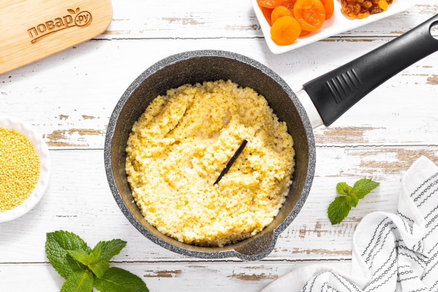 Доведите до кипения, накройте крышкой и варите на умеренном огне до готовности примерно 20 минут. После извлеките ванильный стручок, а готовую кашу немного остудите.