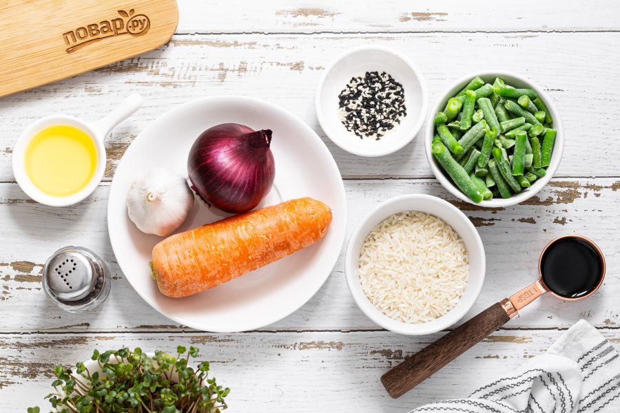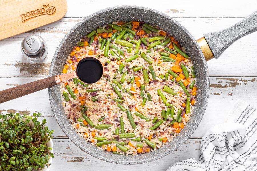 Добавьте соевый соус, все перемешайте и готовьте, пока рис полностью не впитает всю жидкость. Примерно еще 8-10 минут.