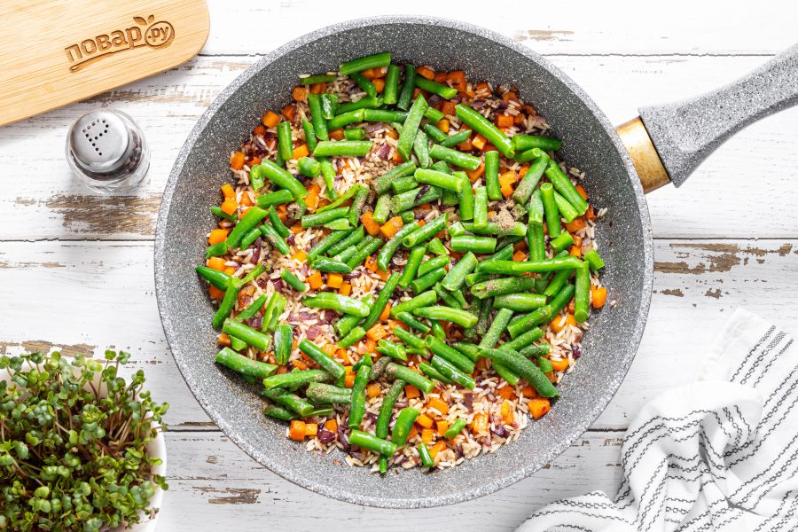 После добавьте стручковую фасоль, поперчите по вкусу. Прогрейте 1-2 минуты все вместе.