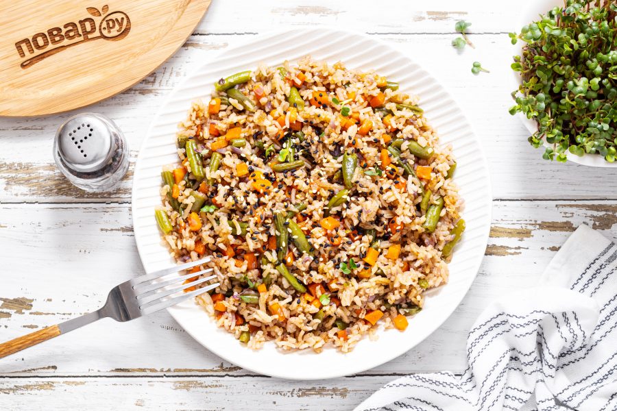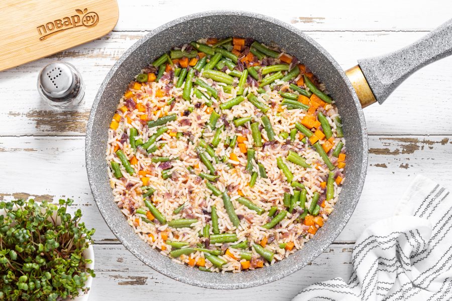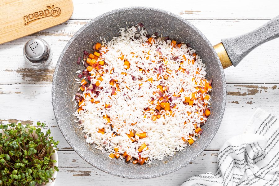 После добавьте рис и обжарьте его еще 4-5 минут.